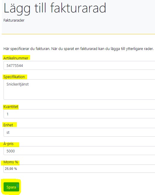 För att lägga till fler fakturarader klicka på knappen ”Lägg till fakturarad” igen och upprepa ovan.