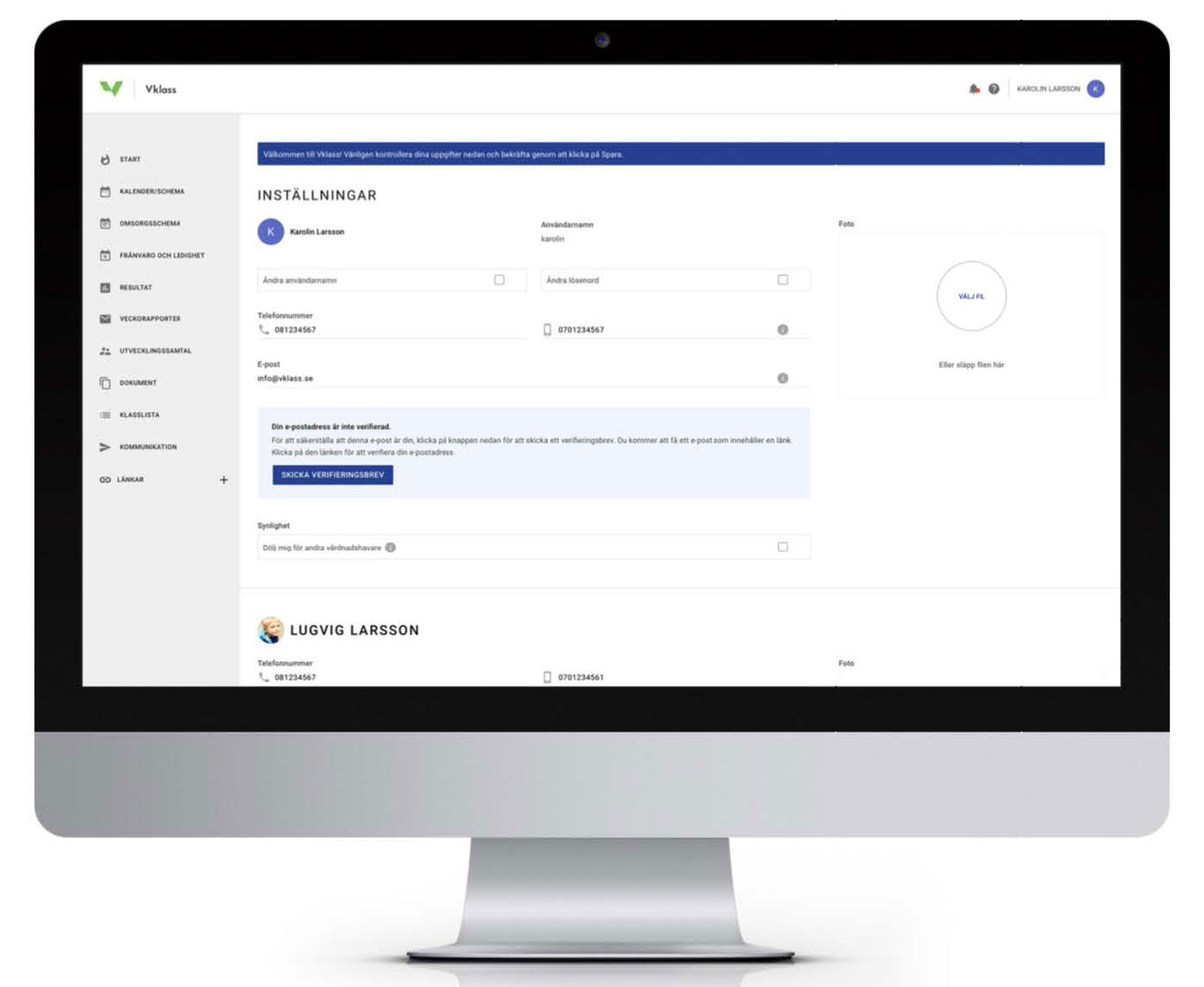 Om din e-postadress är ny eller om den kommit in i Vklass med automatik (inläst från något annat system skolan använder) kan du uppmanas att verifiera den. Detta görs genom att följa instruktionerna i det e-postmeddelande som går till dig när du sparat en ny e-postadress, eller klickat på knappen "Skicka verifieringsbrev" som visas om adressen är overifierad.